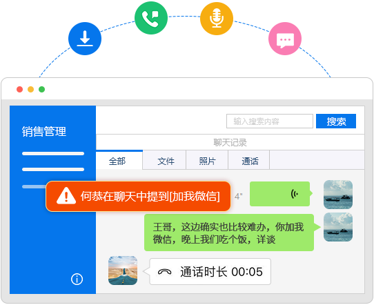 销售客户聊天内容云端存档,长期保存;后台可以实时查看、检索、导出;销售每日的通话记录,通话录音实时上传;支持后台实时查看和导出,随时质检